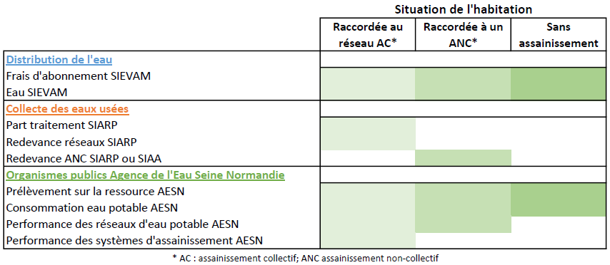 Les lignes des parties “Collecte et traitement des eaux usées” et “Organismes publics” sont facturées en fonction de la situation de chaque habitation :